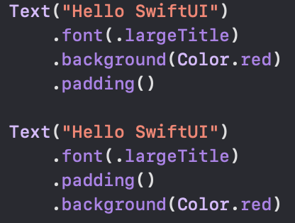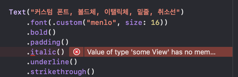 padding 수식어를 사용한 후에 some View 가 반환되었으므로 Text전용 수식어인 italic 사용시 에러가 뜨는 모습이다.
