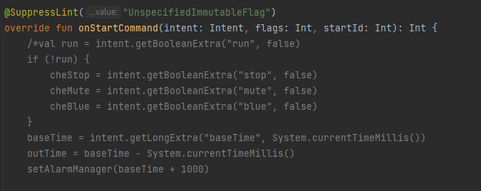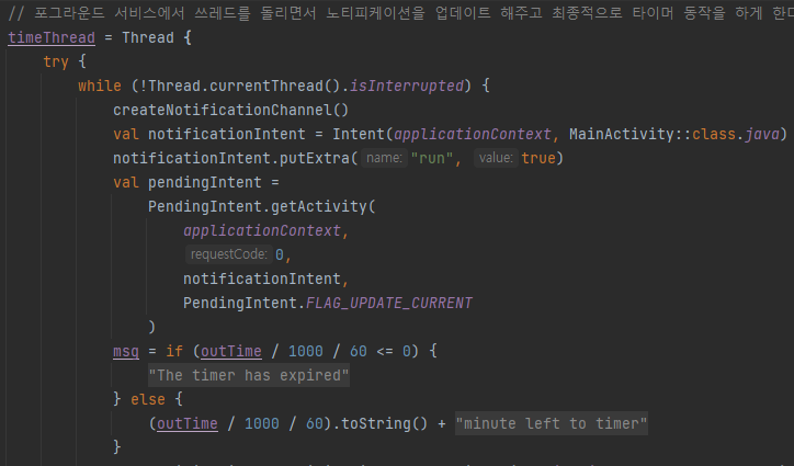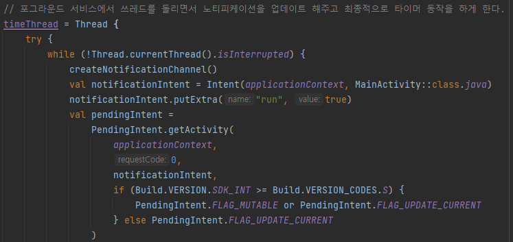 쓰레드 안의 running 코드 블록에 penddingIntent를 사용하는곳이 또 보였고, 이곳은 버전별 분기처리가 되어있지 않았다.