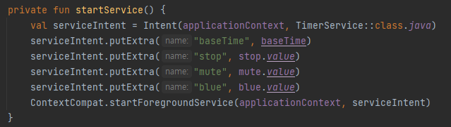 분명 서비스 실행 코드에 startForegroundService() 메서드로 제대로 intent와 context가 삽입되고 있으며
