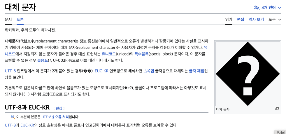 웹사이트에서는 보통 저런 UTF-8로 읽을 수 없는 문자일 경우 대체문자라는걸 통해서 보여주게 된다. 흔히 말하는 깨진 문자다.