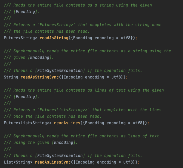 위 에러는 UTF-8 인코딩 형식이 아닌 파일을 UTF-8 형식으로 읽고 쓰려고 했기 때문에 발생하는 에러이다. 위의 사진에서 알 수 있듯이 플러터는 txt 파일을 읽고쓸때 매개변수를 받지 않으면 기본적으로 UTF-8 형식을 사용한다. 따라서 다른 인코딩 형식의 파일을 읽고 싶다면 encoding 매개변수에 알맞는 인코딩 형식을 넣어주어야 한다.