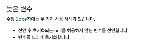Dart 공식문서를 late의 사용은 2가지 사용 방법이 있으며,