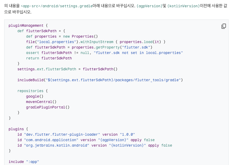 [Flutter] gradle plugin 마이그레이션 kotlinVersion, agpVersion 찾기 본문
